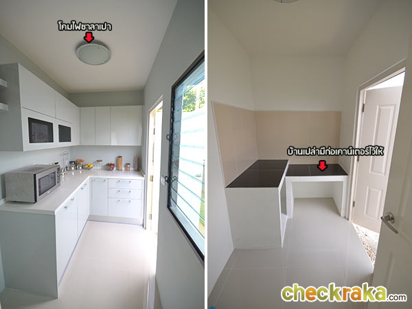 (ภาพซ้ายมือเป็นครัวของบ้านตัวอย่าง ส่วนภาพขวามือเป็นครัวของบ้านเปล่าแบบที่ขายจริง)