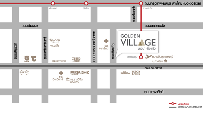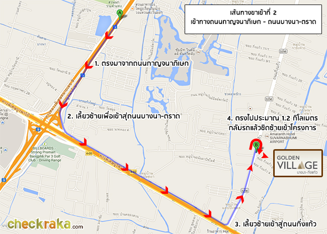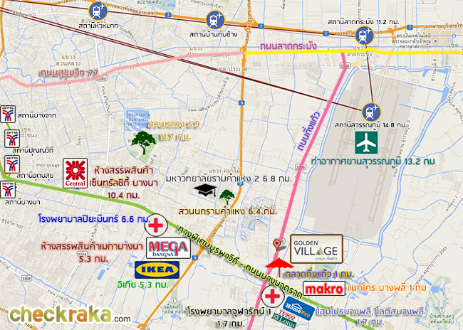 ภาพแสดงระยะทางระหว่างแอร์พอร์ตลิงก์ สถานีลาดกระบัง ถึงโครงการโกลเก้น วิลเลจ บางนา - กิ่งแก้ว
