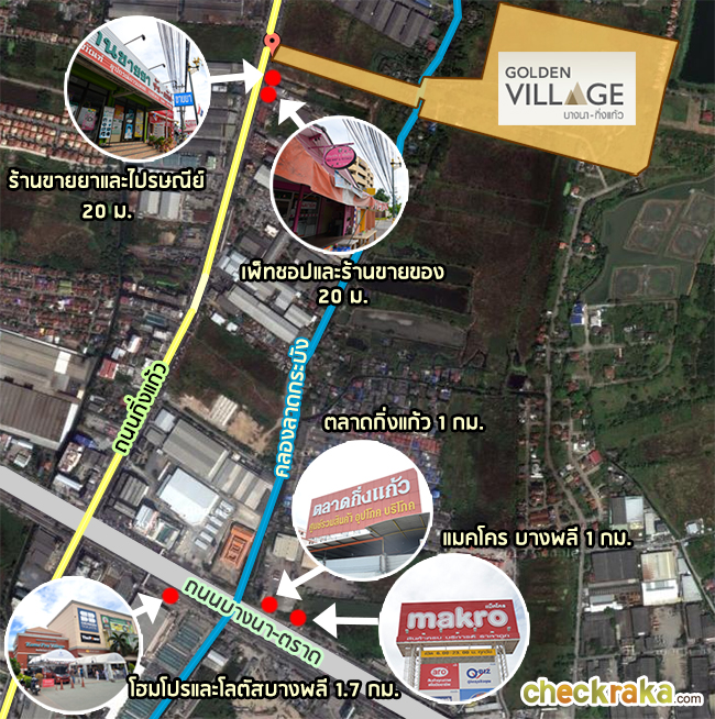 ภาพร้านค้าใกล้ๆ กับโครงการริมถนนกิ่งแก้ว ะยะทางห่างจากโครงการ 20 ม. ส่วนบริเวณทางเข้าถนนกิ่งแก้วฝั่งถนนบางนา-ตราด เต็มไปด้วยร้านอาหารและร้านค้าต่างๆ มากมาย มีทั้งตลาดกิ่งแก้ว และที่อยู่ติดกันก็คือแมคโคร บางพลี ซึ่งจุดนี้จะอยู่ห่างจากโครงการประมาณ 1.2 กิโลเมตร