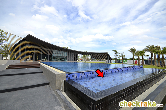 ด้านหน้าของสระว่ายน้ำยังมีสระตื้นๆ ติดกับสระบัวเสริมเข้ามาเอาไว้แช่น้ำเล่นๆ ได้ค่ะ