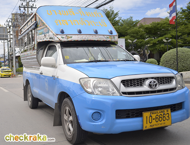 สามารถเดินทางด้วยรถเอกชนร่วมบริการปรับอากาศ (ครีมน้ำเงิน) สาย 553 ฟาร์มจระเข้ - สุวรรณภูมิ รถให้บริการตั้งแต่เวลา 04.00 - 22.00 น. ค่ะ หรือจะใช้บริการรถสองแถวสายบางพลี - กิ่งแก้ว ตลาดหัวตะเข้ก็ได้ค่ะ