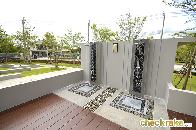 - ตัวโครงการโดยรวมและส่วนกลาง - แม้ว่าด้านหน้าของโครงการจะติดกับถนนใหญ่ แต่ตัวส่วนกลาง และบริเวณที่อยู่อาศัยจะอยู่ลึกเข้าไปอีกประมาณ 400-500 เมตร ถ้ามีรถส่วนตัวเข้า-ออกก็ไม่มีปัญหา เนื่องจากตัวบ้านที่ไม่ติดถนนใหญ่ทำให้มีความสงบ และเป็นส่วนตัวมากขึ้นเพราะจะลดเสียงจากการจราจร และฝุ่นควันได้มากทีเดียว พื้นที่โครงการทั้งหมดคือประมาณ 40 ไร่ และมีจำนวนบ้าน 186 หลัง เท่าที่เราเดินดูบรรยากาศภายในโครงการถือว่าไม่หนาแน่น เพราะบ้านหลายหลังพื้นที่ไม่ได้ใหญ่โตนัก ประกอบกับถนนภายในโครงการถือว่ากว้างใช้ได้ ทำให้บรรยากาศในโครงการดูสบายๆ ไม่ดูอึดอัด หรือหนาแน่น ส่วนกลางของโครงการถือได้ว่าเป็นจุดเด่นอย่างหนึ่ง เพราะมีให้ครบเลยทั้งคลับเฮ้าส์ขนาดใหญ่ดีไซน์ดูดี ที่มีทั้งสระว่ายน้ำ ฟิตเนส และสวนพักผ่อนสีเขียวรอบๆ คลับเฮ้าส์ แต่น่าเสียดายนิดนึงว่าสวนสาธารณะน่าจะมีอีกสักหนึ่งจุดสำหรับบ้านที่อยู่ด้านใน เพราะถ้ามี ก็จะทำให้บ้านที่อยู่ด้านในโครงการได้ความร่มรื่น และใกล้ชิดกับพื้นที่สีเขียวได้มากกว่านี้อีก