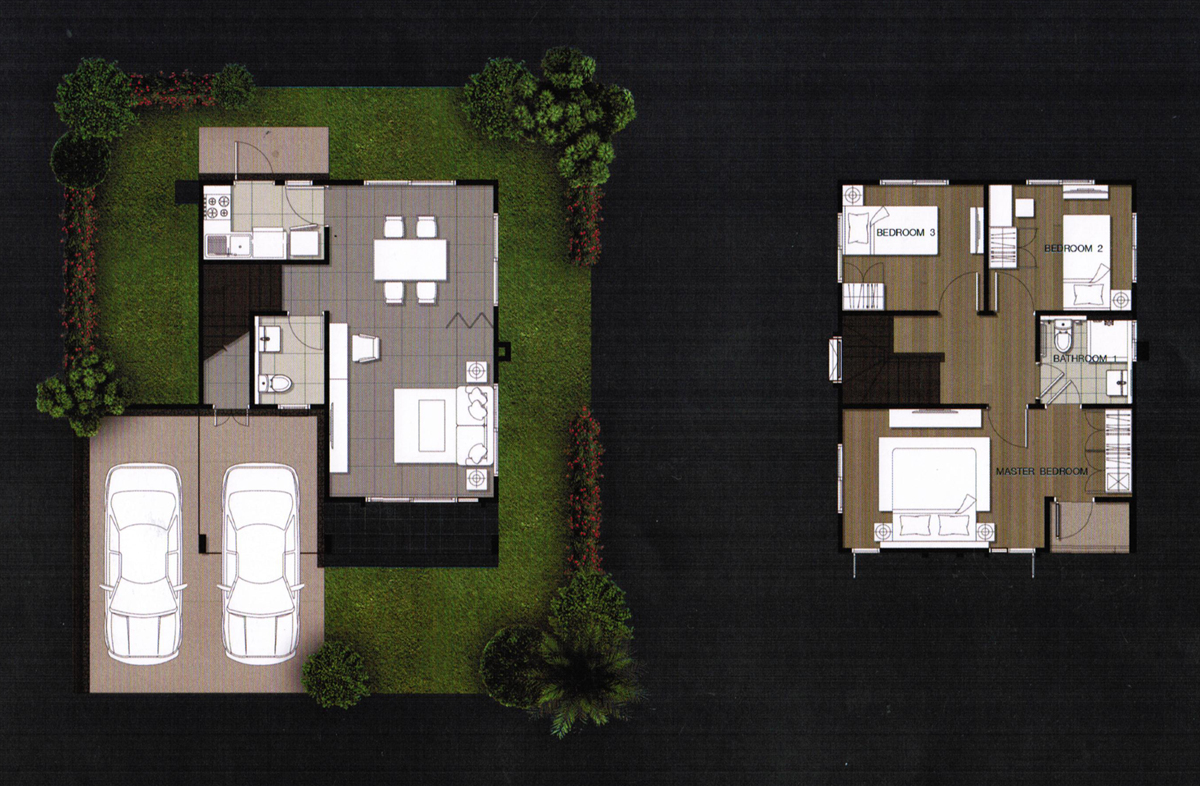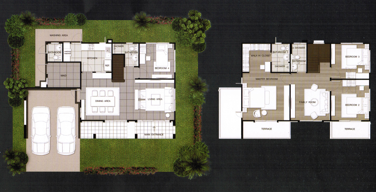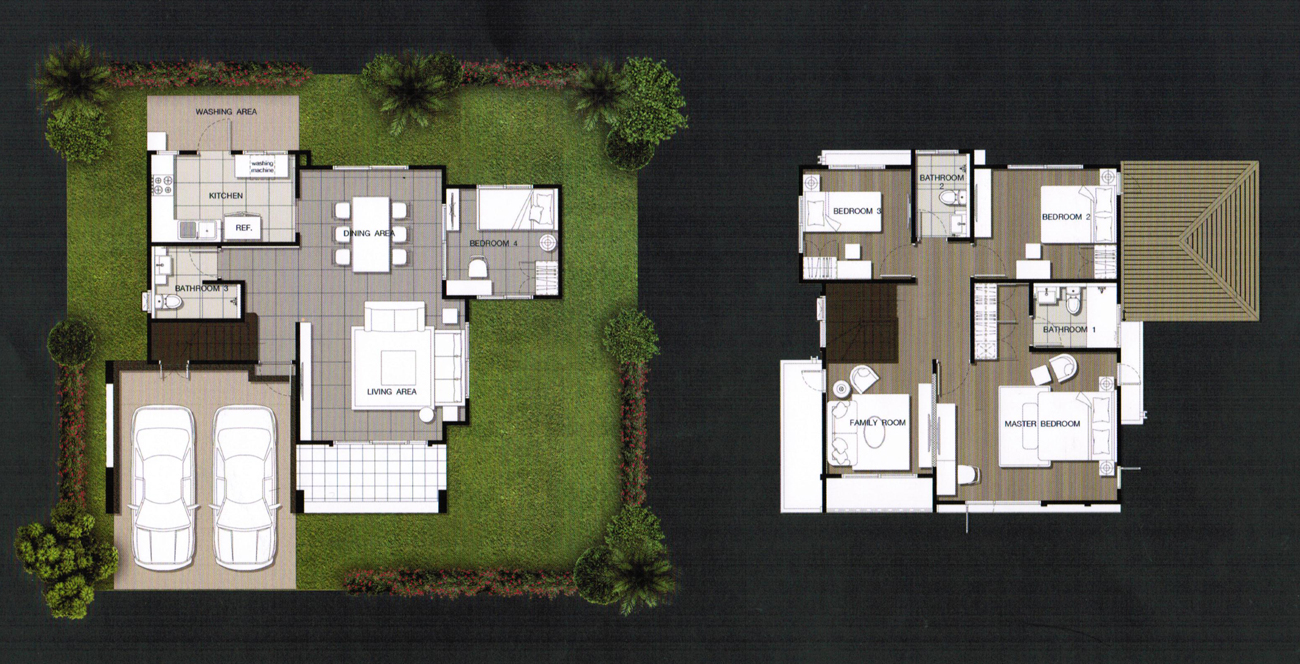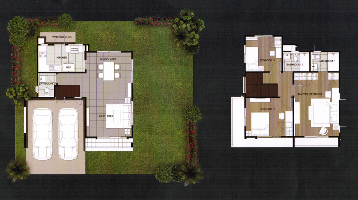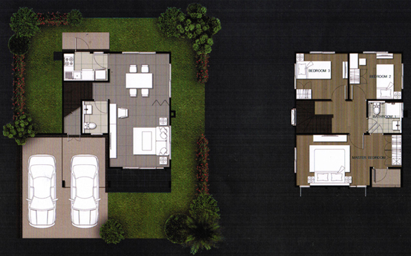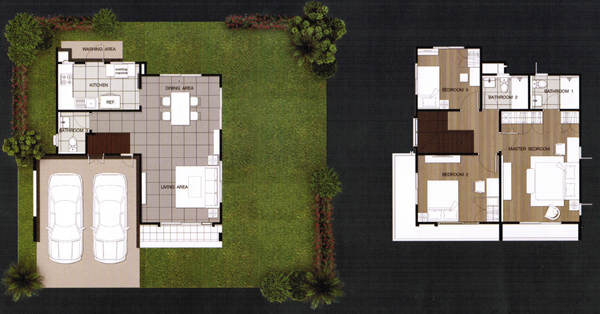 4. แบบบ้าน Pearl (เพิร์ล) - บ้านเดี่ยวที่สร้างบนขนาดที่ดินเริ่มต้นตั้งแต่ 60 ตร.ว. ขึ้นไป และมีขนาดพื้นที่ใช้สอย 198 ตร.ม. ฟังก์ชันบ้านแบบ 4 ห้องนอน (3 ห้องนอนด้านบน และ 1 ห้องนอนด้านล่าง), 3 ห้องน้ำ (2 ห้องน้ำบน และ 1 ห้องน้ำล่าง), ห้องรับประทานอาหาร, ห้องครัวแยกเป็นสัดส่วน, 1 ห้องพักผ่อน (ด้านบน), 1 ห้องแม่บ้าน (พร้อมห้องน้ำแยก) ที่จอดรถ 2 คัน (