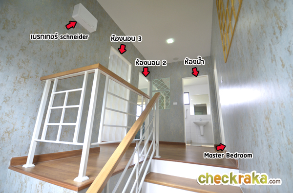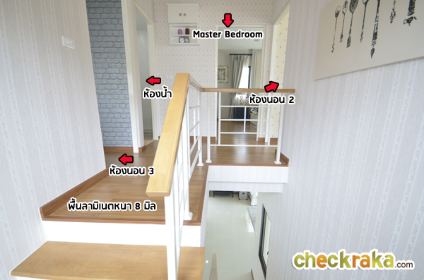 ขึ้นมาชั้น 2 พื้นชั้นนี้เป็นลามิเนตหนา 8 มิล พร้อมบัวล่าง การจัดวางห้องนอน 2 และ 3 จะอยู่ฝั่งหลังบ้าน