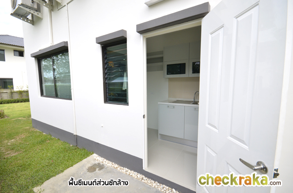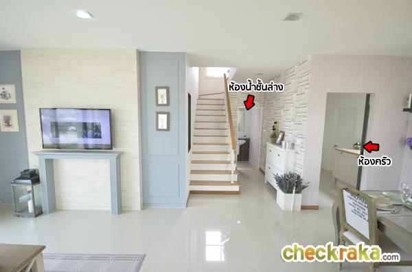เข้ามาดูห้องครัว ประตูเปิดเข้าครัวเป็นแบบธรรมดาไม่ใช่บานเลื่อน บ้านที่ส่งมอบจริงจะก่อเคาน์เตอร์เข้ามุม