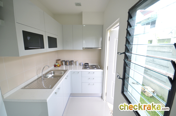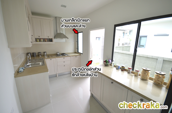เข้ามาดูห้องครัวเป็นครัวแยก ภายในห้องมีหน้าต่างบานใหญ่ให้พร้อมบานเกล็ด บ้านที่ขายจริงจะก่อเคาน์เตอร์เข้ามุม