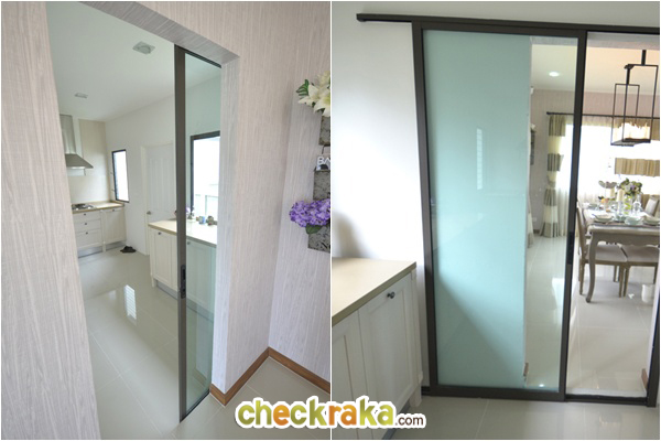 กลับเข้ามาดูประตูครัวเป็นแบบบานเลื่อนซึ่งประตูแบบนี้จะเก็บกลิ่นได้ดีกว่าประตูธรรมดา แถมหน้าตายังดูดีกว่าด้วยค่ะ