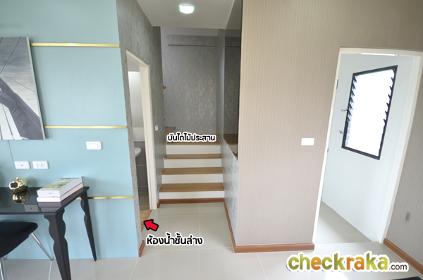 กลับเข้ามาดูในตัวบ้าน ห้องน้ำชั้นล่างจะอยู่ฝั่งซ้ายของบันได และขนาดของบันไดจะเล็กกว่าบ้านแบบที่แล้ว