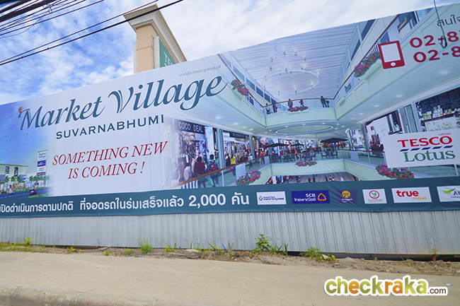 ภาพป้ายประชาสัมพันธ์โครงการก่อสร้างมาร์เก็ตวิลเลจ สุวรรณภูมิ ห้างสรรพสินค้าที่ใหญ่และครบครันที่สุดก็คือเมกา บางนา ห่างจากโครงการประมาณ 5.3 กิโลเมตร ประกอบไปด้วยห้างสรรพสินค้าเมกา บางนา, โรบินสัน, โฮมโปร และอิเกีย