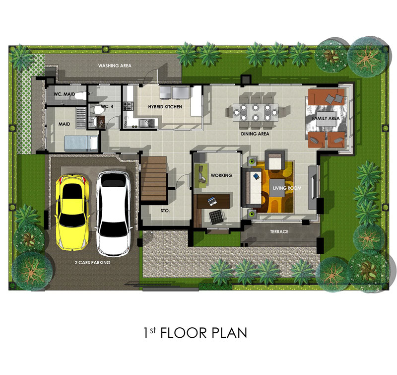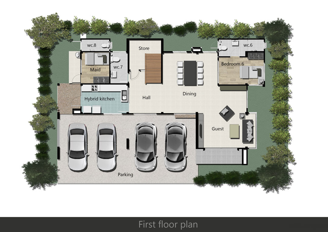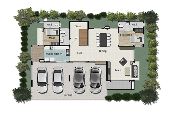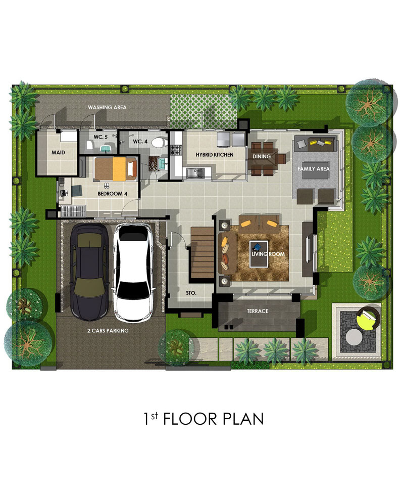 1) แบบบ้าน CAVANA (ไซส์เล็ก) สร้างบนแปลงที่ดินเนื้อที่ประมาณ 54-90 ตร.วา ขนาดพื้นที่ใช้สอย 297 ตร.ม. 6 ห้องนอน 7 ห้องน้ำ 1 ห้องพักผ่อน ห้องครัว ห้องแม่บ้านพร้อมห้องน้ำแยกส่วน และ 3 ที่จอดรถ (