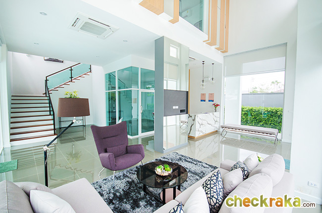 รับรองแขกให้โปร่งโล่ง ด้วยเพดานสูงแบบ Double Volume จัดวางชุดรับแขกเข้ามุมไว้ให้นั่งสบาย ส่วนด้านในเป็นบันไดทางขึ้นไปที่ห้องฟิตเนสชั้น 2
