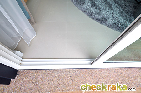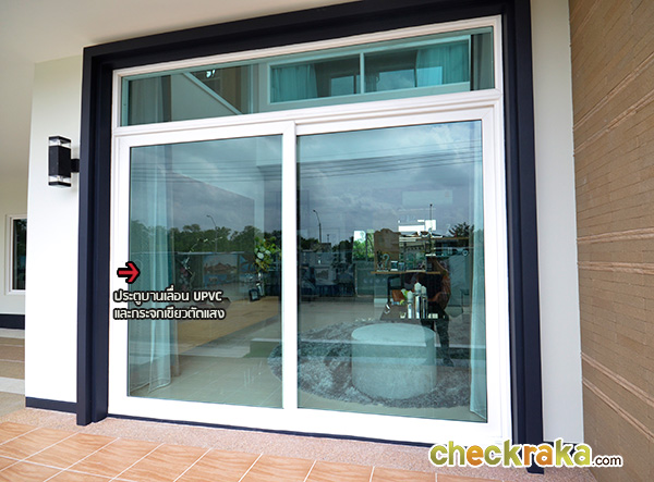 กลับมาทีประตูทางเข้า-ออกหลักที่ชั้น 1 วัสดุที่ใช้เป็นบานเลื่อน UPVC ขนาดใหญ่ ของ AMIGO ส่วนกระจกเป็นกระจกเขียวตัดแสงช่วยลดความร้อนให้บ้านได้ในระดับหนึ่ง งานกรอบรางเลื่อนของประตู UPVC และพื้นในบ้านที่ยกสูงกว่าช่วงหน้าบ้านเล็กน้อย