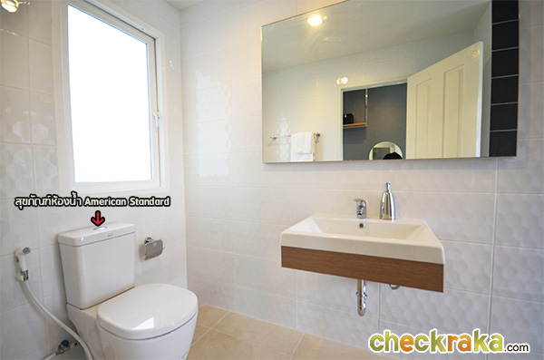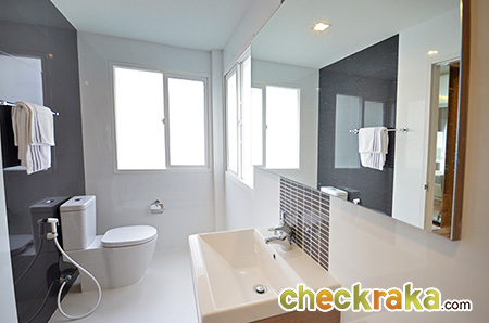 ห้องน้ำในตัวมีลักษณะยาวๆ ฝั่งซ้ายมือจัดเป็นโซนแห้ง ตั้งโถสุขภัณฑ์มีหน้าต่างรับแสงและระบายอากาศ