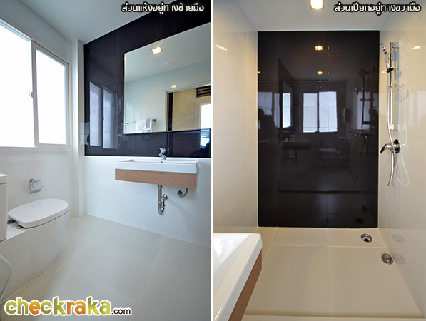 ส่วนโซนอาบน้ำจะอยู่ฝั่งขวามือ พื้นที่ส่วนเปียกนี้มีการลดระดับพื้นมาให้เรียบร้อยค่ะ