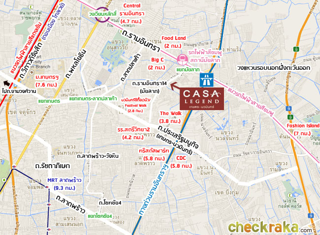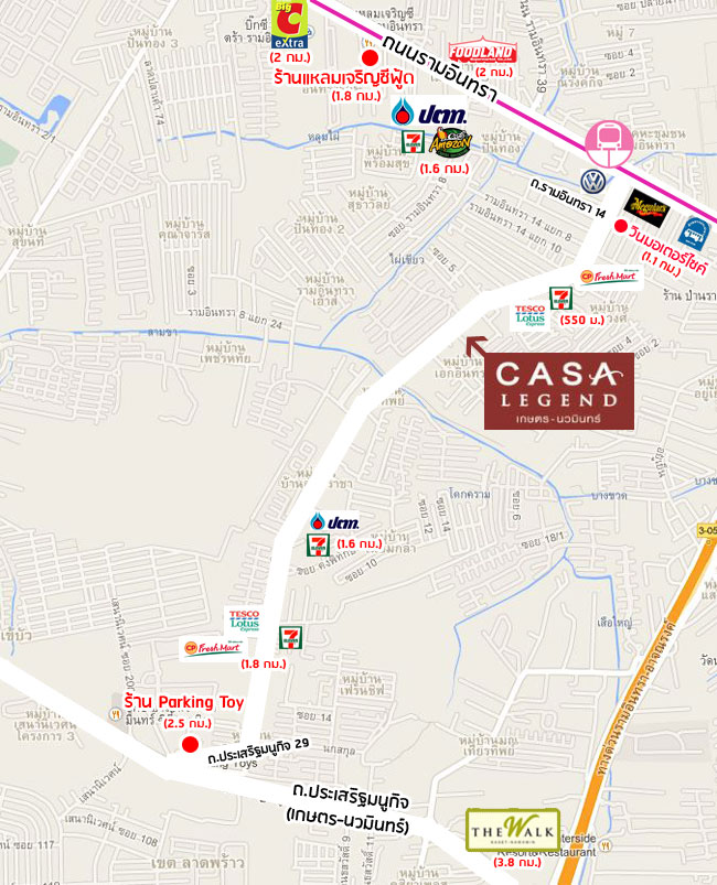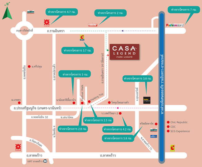 แผนที่โครงการ คาซ่า เลเจ้นด์ เกษตร-นวมินทร์ รูปแผนที่โครงการแจกแจงให้เห็นระยะใกล้-ไกลของโครงการกับสถานที่ หรือ Landmark รอบๆโครงการที่น่าสนใจ Big C Extra (ห่างจากโครงการประมาณ 2 กม.) Food Land (ห่างจากโครงการประมาณ 2 กม.) นวมินทร์ ซิตี้อเวนิว (ห่างจากโครงการประมาณ 2.8 กม.)