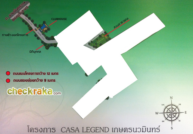 โครงการนี้สร้างอยู่ติดถนนรามอินทรา 14 (ซอยมัยลาภ) ที่ในปัจจุบันขยายถนนใหม่จนมีขนาดกว้างถึง 4 เลน ทำให้สามารถใช้รถได้อย่างสบาย ส่วนที่ตัวโครงการใช้ชื่อทำเลว่าเกษตร-นวมินทร์ ก็เพราะว่าถนนเส้นนี้สามารถวิ่งทะลุไปออกยังถนนเกษตร-นวมินทร์ได้นั่นเองค่ะ สำหรับตัวทางเข้า-ออกของโครงการมีทางเดียวอยู่ที่ด้านหน้าโครงการ โดยทางเข้า-ออกจะเว้นระยะมาจากตัวถนนพอสมควรทำให้ภายในโครงการดูสงบและร่มรื่น ส่วนแปลงที่ดินโครงการมีขนาด 39-3-13 ไร่ จำนวนบ้านรวมทั้งโครงการอยู่ที่ 130 หลัง บ้านในโครงการออกแบบด้วยสไตล์ Modern Contemporary โดดเด่นด้วยการใช้เส้นสายในแนวตั้ง หน้าตาของบ้านเดี่ยวที่นี่จะมีความแปลกใหม่กว่าบ้านของ คาซ่า เลเจ้นด์ ในโครงการอื่นๆ แบบบ้านในโครงการมีให้เลือกทั้งแบบบ้านเดี่ยว 2 ชั้น (ขนาดเล็ก กลาง และใหญ่) และบ้านเดี่ยวแบบ 3 ชั้น (ขนาดเล็ก และขนาดใหญ่) ส่วนพื้นที่ส่วนกลางที่ทางโครงการจัดให้ถือได้ว่ามีมาค่อนข้างครบทีเดียว ทั้ง พื้นที่สวนสาธารณะขนาด 528 ตร.วา 1 จุด ตั้งอยู่ช่วงกลางของแปลงที่ดิน และ Clubhouse ที่มีทั้งห้องรับรอง สระว่ายน้ำและห้องฟิตเนส ตั้งอยู่ช่วงด้านหน้าของโครงการ (ปัจจุบัน Clubhouse เป็นกรรมสิทธิ์ของโครงการ ลูกบ้านที่ต้องการใช้บริการสระว่ายน้ำ ฟิตเนส ต้องชำระค่าบริการในการใช้งาน และทางโครงการไม่อนุญาตให้บุคคลภายนอกเข้าใช้บริการ ยกเว้นแขกของลูกบ้าน ซึ่งต้องชำระค่าบริการเช่นเดียวกันค่ะ)