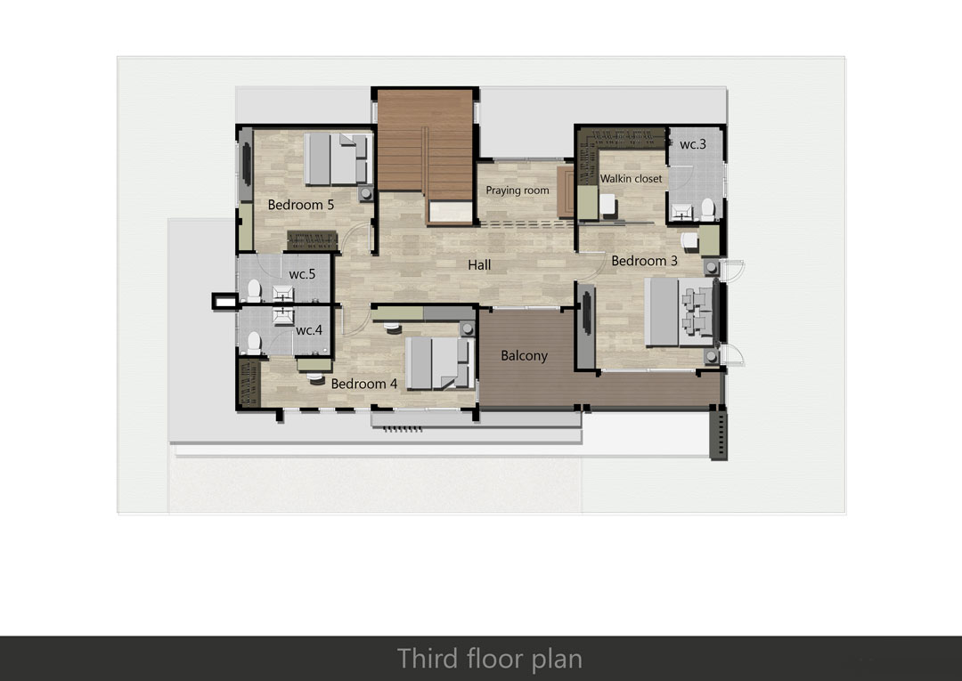 ฟังก์ชั่นห้องต่างๆ บนชั้น 3 ค่ะ ส่วนงานพื้นบ้านชั้นบนเป็นพื้นไม้มะค่าเหมือนกันกับชั้น 2 ค่ะ