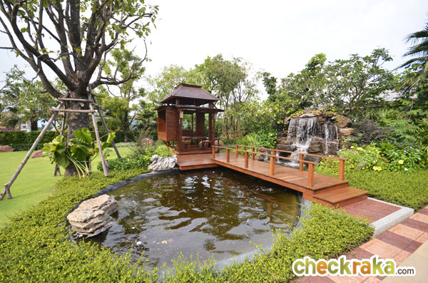 ศาลาพักผ่อนและน้ำตกจำลอง บ้านบางหลังมีให้ บางหลังก็จัดแบบอื่น แล้วแต่ดีไซน์การจัดสวนของแต่ละหลัง