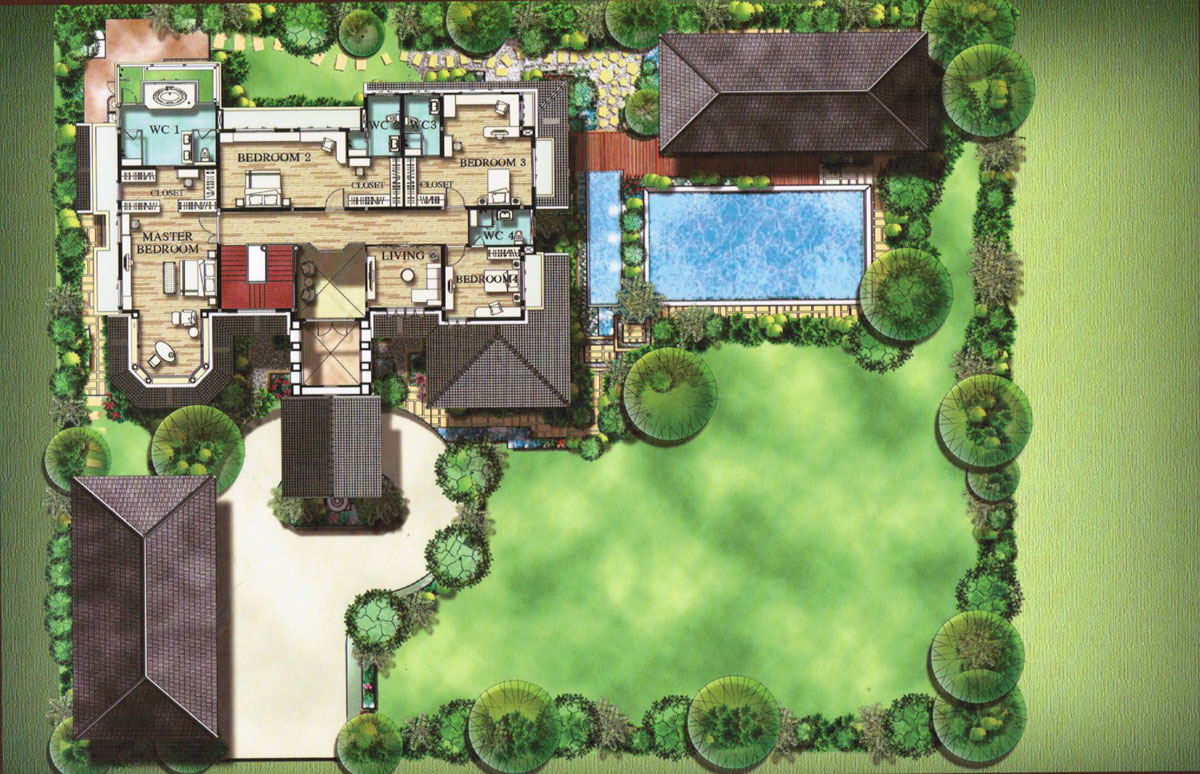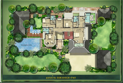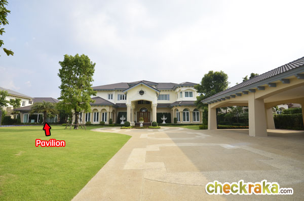 มองจากมุมศาลาพักผ่อนจะเห็นตัวบ้าน สระว่ายน้ำ และเรือนรับรอง