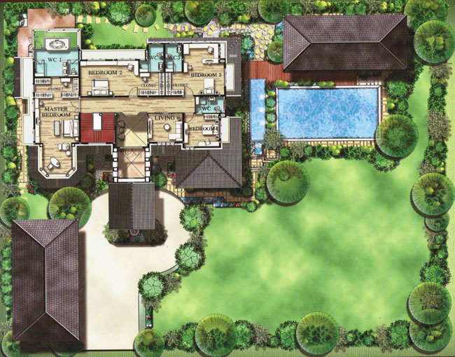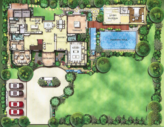 2) แบบบ้าน Aquila Manor สร้างบนแปลงที่ดินเนื้อที่ 503 ตร.ว. ขนาดพื้นที่ใช้สอย 711.8 ตร.ม. 6 ห้องนอน 7 ห้องน้ำ 1 ครัวฝรั่ง 1 ครัวไทย พื้นที่รับประทานอาหาร ห้องพักผ่อน 3 ห้อง ห้องแม่บ้าน 2 ห้อง ที่จอดรถ 5 คัน