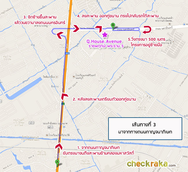 แต่หากขับตรงมาเรื่อยๆ ประมาณ 700 เมตร จากโครงการจะเจอกับจุดกลับรถใต้สะพานเพื่อวนไปอีกฝั่งของถนน