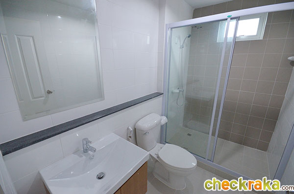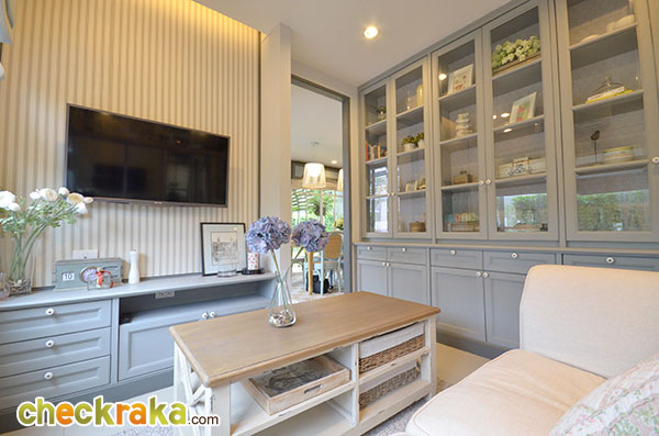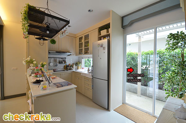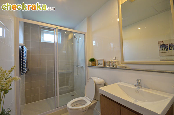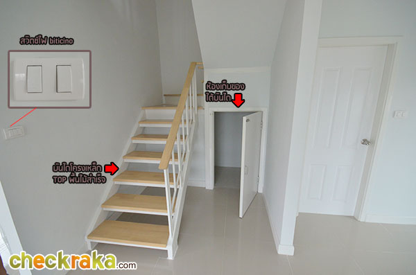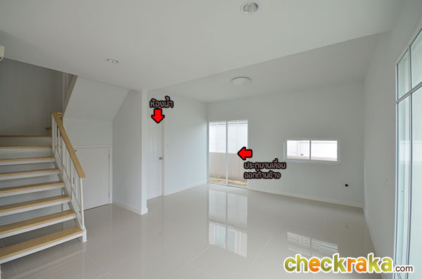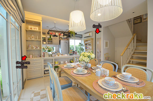 อีกมุมนึงของห้องรับแขกที่ตกแต่งออกมาได้ดูอบอุ่นทีเดียวค่ะ เข้ามาช่วงกลางของตัวบ้านจะเห็นบันไดทางขึ้นชั้น 2 และห้องน้ำค่ะ โถงบันไดขึ้นชั้น 2 มีห้องเก็บของใต้บันไดไว้ให้ด้วย ภายในห้องน้ำชั้นล่างค่ะ สุขภัณฑ์ในห้องน้ำที่โครงการเลือกใช้เป็นของ American Standard ค่ะ แบ่งพื้นที่แยกส่วนเปียกกับส่วนแห้งไว้เรียบร้อยค่ะ พื้นที่ส่วนท้ายของตัวบ้านเตรียมพื้นที่ไว้เป็นส่วนเตรียมอาหาร หรือ Pantry