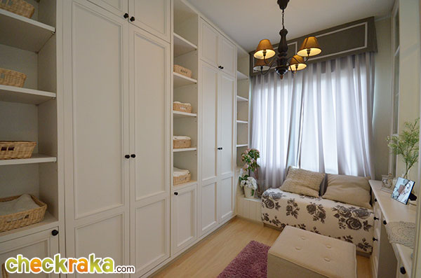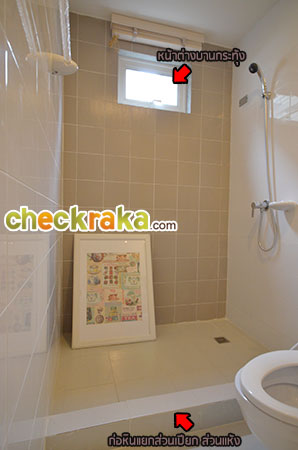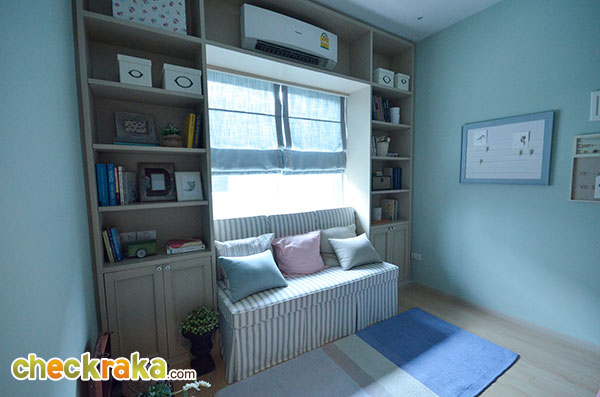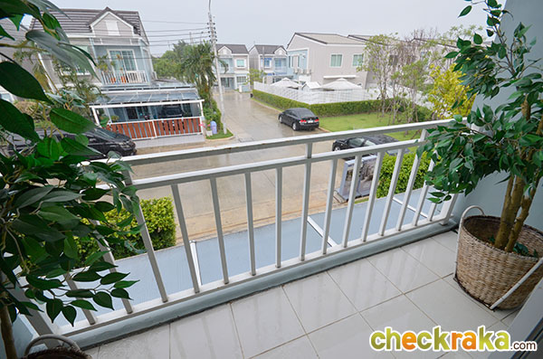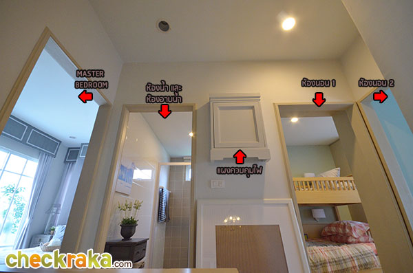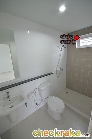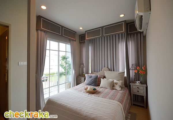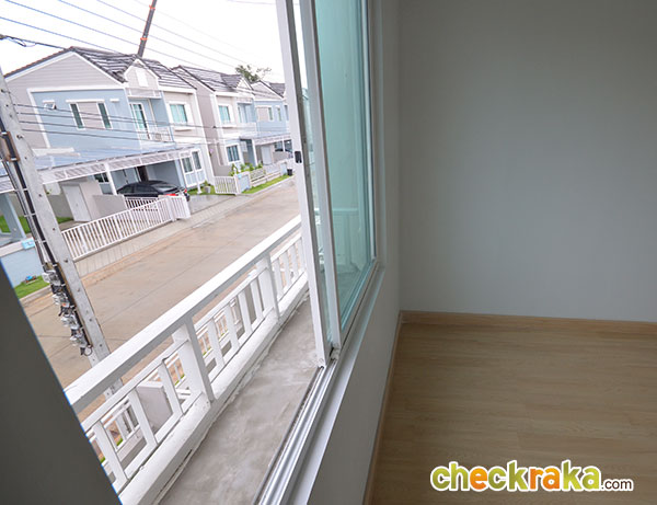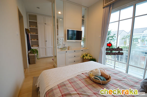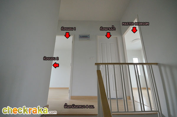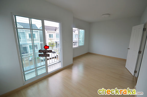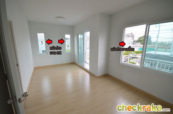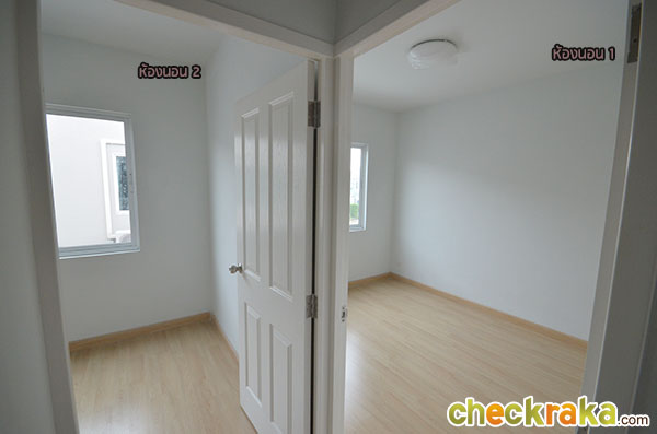 พื้นที่ซักล้างหลังบ้านขนาดกว้างประมาณ 2 เมตรตรงตามมาตรฐานค่ะ โถงบันไดบ้านชั้น 2 (วัสดุเป็นโครงสร้างบันไดเหล็ก Top ไม้สำเร็จค่ะ) ฟังก์ชันตำแหน่งห้องต่างๆ บนบ้านชั้น 2 ค่ะ เริ่มกันที่ภายในห้องนอน 2 กันค่ะ ในห้องมีหน้าต่างบานเลื่อนคู่นึงค่ะ ถ่ายย้อนอีกมุมของห้องนอนที่ 2 ค่ะ ต่อมาคือห้องนอนที่ 1 ค่ะ ภายในมีหน้าต่างบานเลื่อนให้คู่นึงเหมือนกันกับห้องก่อนหน้าค่ะ ถ่ายย้อนอีกมุมของห้องนอนให้ชมค่ะ ขนาดห้องขนาดพอดีๆ นิดนึงค่ะ ห้องต่อมาคือห้องอาบน้ำค่ะ สุขภัณฑ์เป็นของ American Standard ภายในห้องแยกพื้นที่ส่วนเปียกส่วนแห้ง ด้วยฉากกั้นอาบน้ำให้เรียบร้อยค่ะ ชั้นบนแบ่งพื้นที่ใช้งานในห้องน้ำได้ลงตัวทีเดียวค่ะ ส่วนห้องนอนสุดท้ายที่ตั้งอยู่ช่วงด้านหน้าของตัวบ้านคือห้องนอนใหญ่ Master bedroom ค่ะ ห้องนี้จะเป็นห้องแบบหน้ากว้าง จัดพื้นที่ส่วนพักผ่อนไว้ฝั่งเดียวกับประตูระเบียง ส่วนอีกฝั่งจัดไว้เป็น Walk in closet ค่ะ งานรางเลื่อนของประตูระเบียงค่ะ ระเบียงหน้าบ้านขนาดกำลังดีค่ะ ราวกันตกเป็นเหล็กกล่องทาสีขาวเข้ากันกับสีหวานๆ ของตัวบ้านค่ะ ถ่ายย้อนจากกลางห้องให้ดูเต็มๆ กับพื้นที่ส่วนพักผ่อน วางเตียงใหญ่แล้วยังมีพื้นที่เหลือให้วางตู้หัวนอนได้ทั้งสองฝั่ง (ตำแหน่งแอร์ติดแบบห้องตัวอย่างน่าจะเป็นจุดที่ดีที่สุด เพราะเย็นและไม่เป่าตรงเข้าศีรษะของคนนอนค่ะ) อีกฝั่งของห้องจัดไว้เป็นพื้นที่ส่วน Walk-in closet ค่ะ หลังม่านเป็นหน้าต่างบานเลื่อนที่มีชานเล็กๆ ไว้ให้ปลูกต้นไม้ได้ด้วยนะคะ (ชมภาพชานนอกหน้าต่างได้ที่บ้านเปล่ามาตรฐานด้านล่างค่ะ) บ้านเปล่ามาตรฐาน