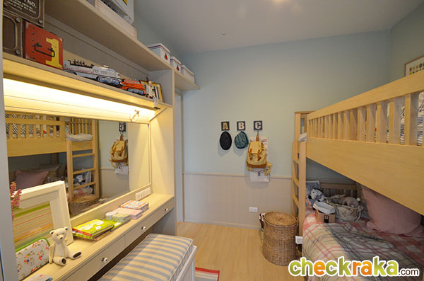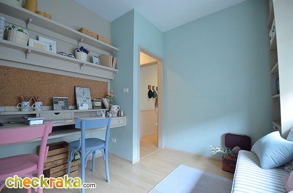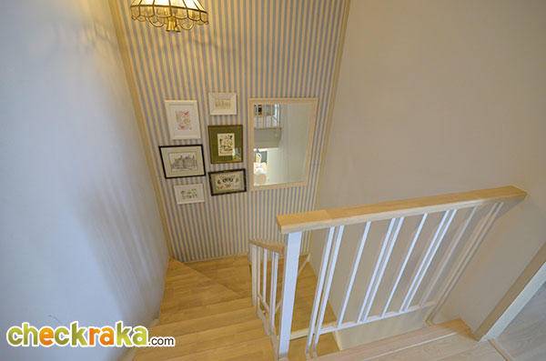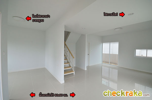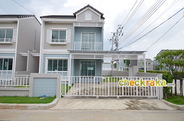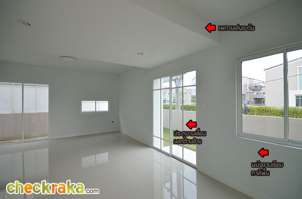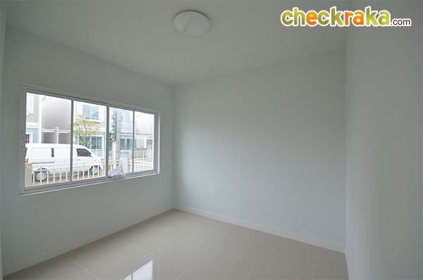 ชมบ้านตัวอย่างสวยๆ ไปแล้วทีนี้เรามาชมบ้านเปล่ามาตรฐานที่ขายจริงกันบ้างค่ะ ตัวบ้านทาสีฟ้าหวานๆ ตัดด้วยลายเส้นสีขาว ดูน่ารักและอบอุ่นดีค่ะ ส่วนประตูรั้วที่ได้จะเป็นประตูรั้วเหล็กสีขาวสูงเกือบเมตร เป็นรั้วบานพับแบบมีล้อเลื่อนค่ะ ช่วงหน้าบ้านมีพื้นที่จัดสวนที่ปูหญ้าไว้ให้เรียบร้อย ส่วนโถงทางเข้าบ้านปูด้วยพื้นกระเบื้อง และยกพื้นให้สูงกว่าพื้นโรงรถขึ้นมาประมาณสักสามนิ้วกว่า ช่วยกันฝุ่นจากโรงรถลอยเข้าตัวบ้านค่ะ กันสาดสีฟ้าด้านหน้าตัวบ้านที่ทางโครงการติดตั้งให้พร้อมช่วยกันฝนสาดเข้าบริเวณประตูทางเข้าหน้าบ้าน ส่วนพื้นที่จัดสวนด้านข้างปูหญ้ามาให้เรียบร้อยนะคะ ประตูทางเข้าหลักที่โครงการเลือกใช้เป็นประตูบานเลื่อนกรอบ UPVC สีขาวแบบมีโครงลายเส้นตัดขวางช่วยเพิ่มลูกเล่นค่ะ ภายในตัวบ้านฝั่งด้านซ้ายมือกั้นผนังแยกส่วนห้องรับแขก และมีผนังเล็กใต้บันไดอีกอันที่ช่วยแบ่งพื้นที่ภายในบ้านให้ดูเป็นสัดส่วนขึ้น พื้นที่ภายในห้องรับแขก มีกระจกบานเลื่อนไว้รับแสงและใช้เปิดรับลม ขนาดกำลังดีสำหรับใช้รับแขกสัก 4-5 คน ภายในบ้านฝั่งขวามือมีกระจกบานเลื่อน และประตูบานเลื่อนไว้ให้เปิดออกไปที่สวนด้านข้างของตัวบ้าน โถงทางขึ้นบันไดชั้น 2 อยู่ช่วงกลางบ้านก่อนห้องน้ำ ส่วนพื้นที่ด้านท้ายของตัวบ้าน มีหน้าต่างบานเลื่อนเล็กๆ และช่องต่อท่อน้ำทิ้งเตรียมไว้ให้วางพวกซิ้งค์ล้างจานเผื่อจัดพื้นที่เป็นครัวเบา ภายในห้องน้ำชั้นล่างเลือกใช้สุขภัณฑ์ American standard แบ่งพื้นที่ส่วนเปียกกับส่วนแห้งด้วยการก่อชั้นหิน สูงประมาณนิ้วกว่าไว้ให้ โซนนี้ถ้าจะใช้อาบน้ำให้ดีคงต้องติดม่านกันน้ำเพิ่มอีกหน่อยค่ะ โซนซักล้างหลังบ้านกว้างประมาณ 2 เมตรกว่า ตัวพื้นเป็นคอนกรีตฉาบเรียบ ส่วนพื้นที่ด้านข้างตัวบ้าน ปูหญ้าไว้ให้ทั่ว ข้างบ้านฝั่งนี้มีคานที่ทำเป็นระแนงเหล็กไว้วางคอมแอร์ซึ่งเป็นส่วนเชื่อมต่อระหว่างบ้านแฝดสองหลัง กลับมาที่โถงบันไดทางขึ้นชั้น 2 ใต้บันไดมีห้องเก็บของเตรียมไว้ให้ด้วยค่ะ ขึ้นมาบนชั้น 2 ของตัวบ้าน จะมองเห็นตำแหน่งฟังก์ชันของห้องต่างๆ ตามนี้ (ตำแหน่งของห้องนอนที่ 2 ติดมุมของผนังเลยมองไม่เห็นประตูทางเข้าค่ะ) มุมทางเข้าระหว่างห้องนอนที่ 2 และห้องนอนที่ 1 ที่อยู่ติดกัน ภายในห้องนอนที่ 2 มีหน้าต่างบานเลื่อนไว้ให้เปิดรับแสงและระบายอากาศ อีกมุมนึงถ่ายย้อนจากหน้าต่างออกมาที่ประตูของห้องนอนที่ 2 ค่ะ ห้องต่อมาคือห้องนอนที่ 1 ซึ่งจะได้หน้าต่างบานเลื่อนคู่นึงไว้เปิดรับแสงและระบายอากาศเช่นเดียวกันค่ะ ภายในห้