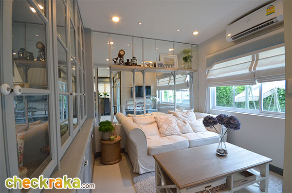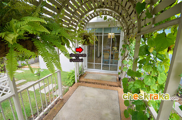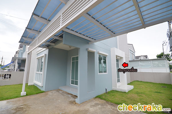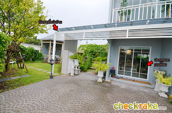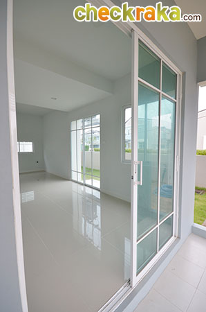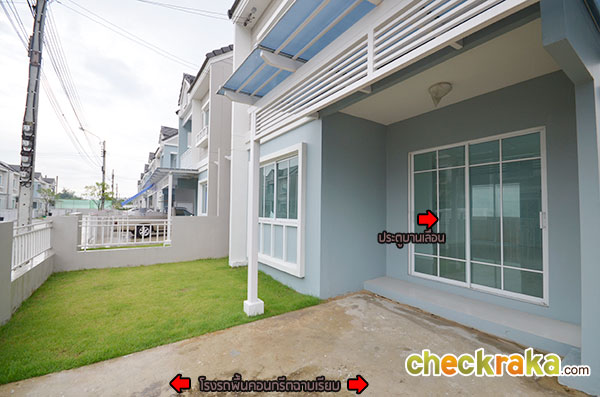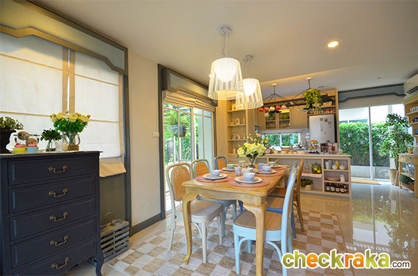 Lay out แบบบ้านแฝด 2 ชั้น 2 ที่จอดรถ (คลิกเพื่อชมแปลนบ้านขนาดใหญ่ ) สำหรับบ้านตัวอย่างจะอยู่ติดสำนักงานขายของโครงการเลยค่ะ โรงรถที่ปูหินนี่บ้านจริงจะเป็นพื้นคอนกรีตฉาบเรียบนะคะ ส่วนพื้นที่รอบๆ บ้านของบ้านตัวอย่างหลังที่โชว์มีที่ดินรอบบ้านค่อนข้างเยอะเลยแต่งเป็นมุมพักผ่อนได้เยอะทีเดียว สวนหน้าบ้านวางชิงช้าเป็นมุมพักผ่อนเล็กๆ บ้านขายจริงมุมนี้จะปูหญ้าสีเขียวไว้ให้เรียบร้อยเลยค่ะ หน้าบ้านตรงทางเข้าบ้านมีติดตั้งกันสาดให้ซึ่งบ้านที่ขายจริงก็จะได้กันสาดแบบนี้เหมือนกันค่ะ ด้านข้างบ้านของบ้านตัวอย่างมีพื้นที่เยอะขนาดจัดเป็นสวนหย่อมส่วนตัวได้เลยทีเดียว มีมุมนั่งเล่นนอกบ้านอย่างนี้ด้วย ทางเดินเชื่อมเข้า ออกประตูด้านข้างของตัวบ้านค่ะ กลับมาที่ในตัวบ้านตรงทางเข้าหลัก มุมมองแรกเมื่อเราเปิดประตูเลื่อนหน้าบ้านเข้ามาค่ะ มองตรงๆ จะเจอกับพื้นที่ส่วนทานอาหาร สำหรับความสูงจากพื้นจรดเพดานของบ้านนี้อยู่ที่ 2.6 เมตรนะคะ ห้องด้านขวามือเป็นห้อง Multi-Function Room ที่สามารถปรับเปลี่ยน ห้องรับแขกหรือห้องนอน ได้อีกด้วย