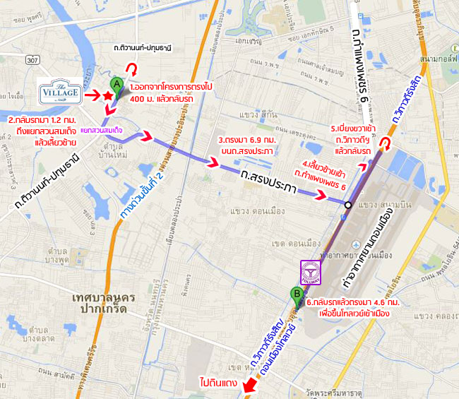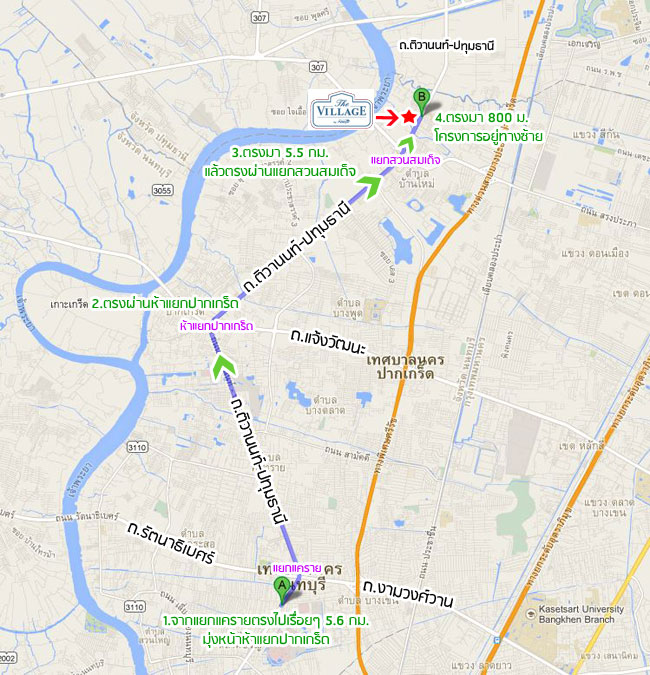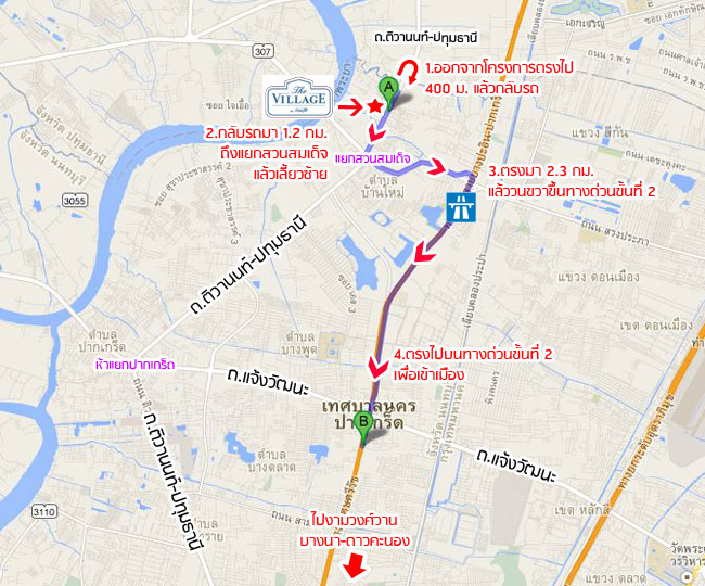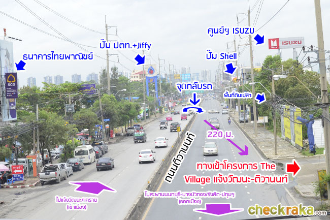 พอถึงตรงแยกสวนสมเด็จแล้วให้เลี้ยวขวาเข้าถนนติวานนท์ค่ะ พอเข้าถนนติวานนท์มาแล้วให้ตรงไปเรื่อยๆ อีกประมาณ 1.8 กม. พอเห็นศูนย์รถยนต์ ISUZU ให้เตรียมชิดซ้ายค่ะ ทางเข้าโครงการ The Village แจ้งวัฒนะ-ติวานนท์ จะอยู่ทางซ้ายมือค่ะ ฝั่งตรงข้ามเยื้องๆ กันจะเป็นตลาดดวงแก้ว และโรงเรียนพระหฤทัยนนทบุรีค่ะ เส้นทางเข้าโครงการที่ 2 มาจากแยกแคราย