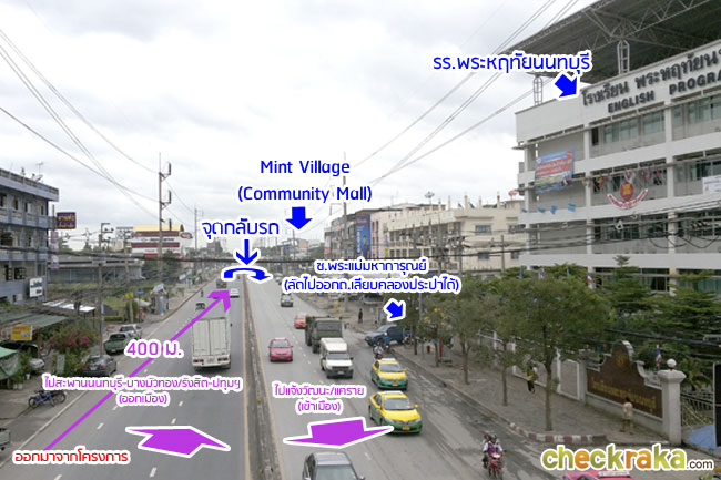 จุดกลับรถเพื่อกลับเข้ามาโครงการอยู่ห่างประมาณ 220 ม. ถ้ามองลงมาจากสะพานลอยคนข้ามหันหน้าไปทางไปถนนรังสิต-ปทุมฯ (ออกเมือง) ออกไปจากด้านหน้าโครงการ 400 ม. ก็จะถึงจุดกลับรถ ฝั่งตรงข้ามก็จะเป็น Mint Village Community Mall และโรงเรียนพระหฤทัยนนทบุรีค่ะ