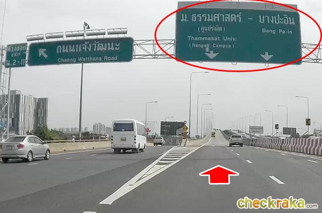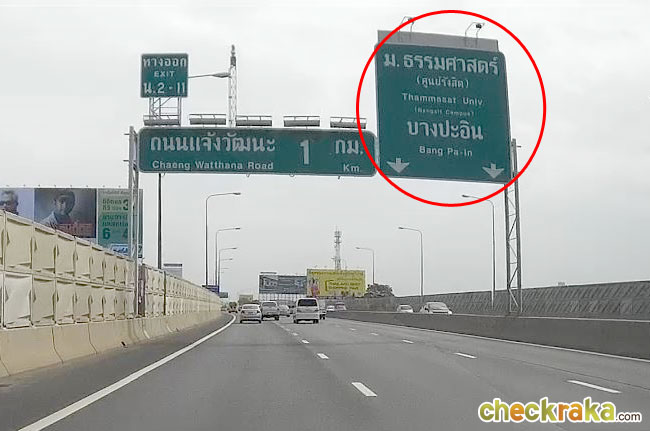 ลองมาดูภาพด้านล่างประกอบตัวอย่างการเดินทางดูนะคะ ถ้ามาจากทางด่วนขั้นที่ 2 จากในเมืองมุ่งหน้าบางปะอิน ให้ตรงมาเรื่อยๆ โดยยึดป้าย ม.ธรรมศาสตร์(ศูนย์รังสิต)-บางปะอินไว้ค่ะ พอถึงทางลงถนนแจ้งวัฒนะยังไม่ต้องลงค่ะ ให้ตรงไปก่อนโดยยึดป้าย