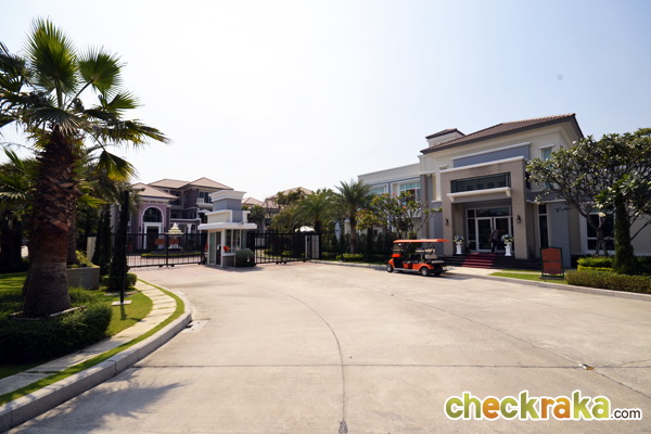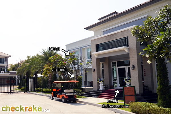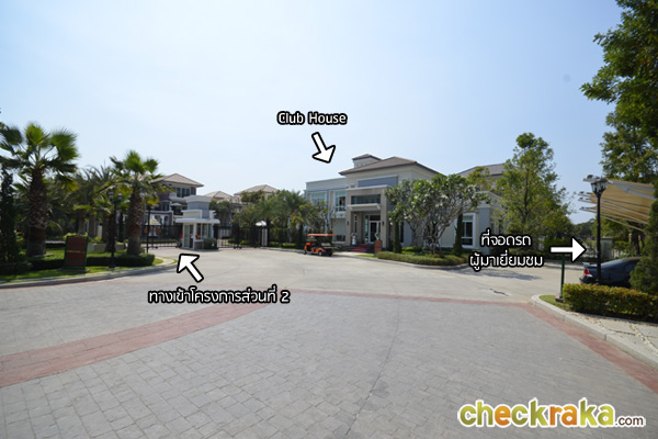 เมื่อเข้ามาแล้ว จะเจอกับคลับเฮ้าส์ ด้านขวามือเป็นที่จอดรถรับรองผู้มาเยี่ยมชม และที่เห็นเป็นประตูคือ