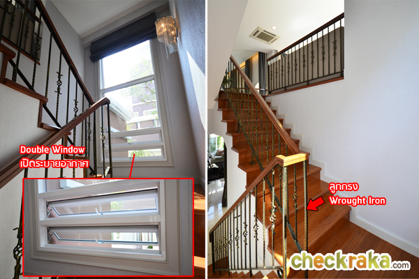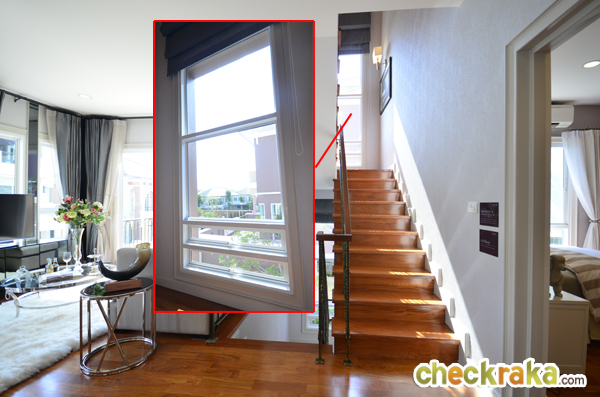ส่วนกระจกรับแสงตรงบันไดยาวเกือบจรดฝ้าเพดาน บานกระทุ้งด้านล่างสามารถเปิดได้ทั้ง 2 บาน