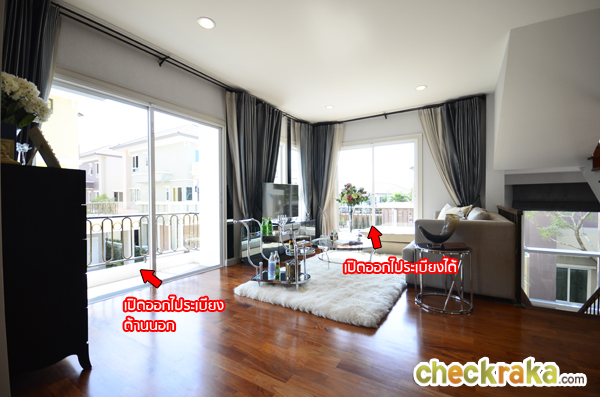 ด้านข้างมีประตูบานเลื่อนสามารถเปิดออกไปเดินเล่นชมวิวได้เลยค่ะ ส่วนด้านหลังโซฟาบ้านที่ขายจริงจะเจาะกำแพง