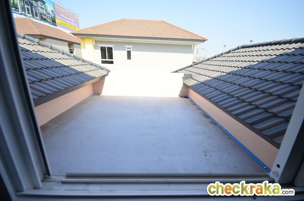 ด้านหลังหน้าต่างเปิดออกไปจะเป็นแบบนี้ค่ะ พื้นที่ด้านนอกสามารถปรับเป็นสวนนั่งเล่น ปูหญ้าเทียม วางโต๊ะเก้าอี้