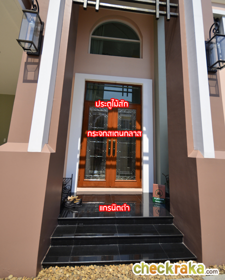 กลับมาดูที่ทางเข้าหลักกันค่ะ ประตูทางเข้าหลักของบ้านนี้จะอยู่ข้างโรงจอดรถ โค้งประตูและเสาทรงสูง ทำให้เห็น