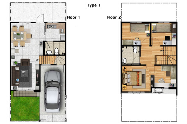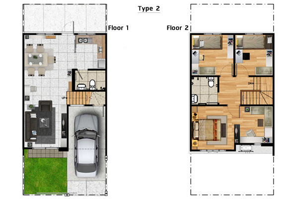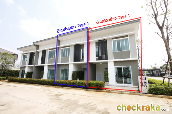 แบบบ้านที่เราจะพาไปชม มีทั้ง Type 1 และ Type 2 และบ้านส่งมอบของทั้งสองแบบเลยค่ะ โดยทั้งสองแบบบ้านนี้มีลักษณะโครงสร้าง มีความต่างกันที่สีของตัวบ้าน ส่วนภายในต่างกันที่พื้นที่ใช้สอยและความลึก โดยบ้านแบบที่ 2 นั้นจะมีพื้นที่ใช้สอยเยอะกว่า อย่างเช่นในส่วนของห้องครัว ก็จะมีพื้นที่ใช้งานได้กว้างขวางขึ้น และห้องนอนก็จะกว้างขึ้นมา เราไปดูภาพบ้านตัวอย่างกันเลยค่ะ