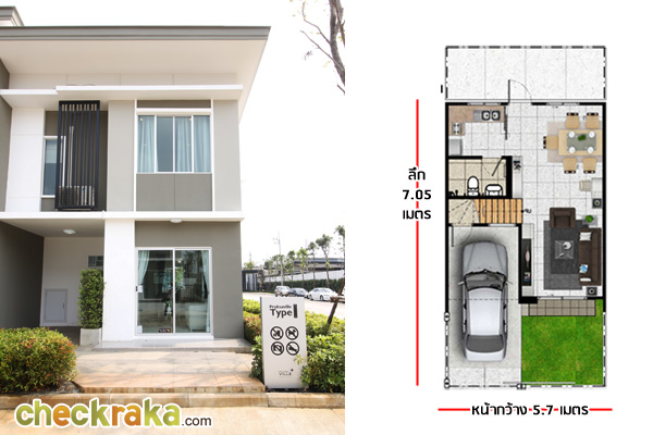 1) แบบบ้าน Type 1 ประกอบไปด้วย 3 ห้องนอน 2 ห้องน้ำ 1 ที่จอดรถ หน้ากว้าง 5.7 เมตร ลึกประมาณ 7.05 เมตร