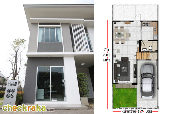 2)แบบบ้าน Type 2 ประกอบไปด้วย 3 ห้องนอน 2 ห้องน้ำ 1 ที่จอดรถ หน้ากว้าง 5.7 เมตร ลึกประมาณ 7.85 เมตร