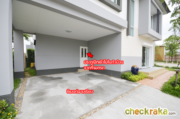 ที่จอดรถเป็นซีเมนต์ฉาบเรียบ สามารถจอดรถได้ 2 คัน ประตูบานสีขาวที่เห็นหากเราซื้อของมาเยอะ หรือฝนตก แดดจัด
