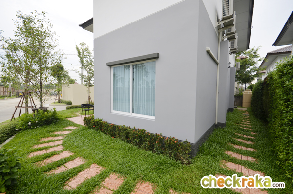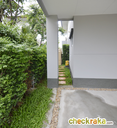 บ้านตัวอย่างจะจัดสวน วางหินเป็นทางเดินรอบๆ บ้านให้ ส่วนบ้านที่ส่งมอบลูกค้าจะปูหญ้าให้ค่ะ