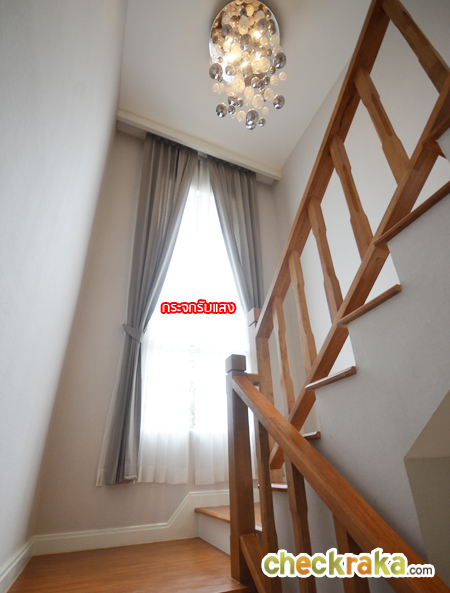 ตรงบันไดมีกระจกรับแสงทรงสูงขนาดใหญ่ ยาวเกือบจรดฝ้าเพดาน ทำให้แสงธรรมชาติเข้าส่วนนี้ได้โดยไม่ต้องเปิดไฟ