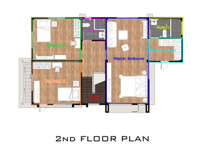 ขึ้นมาที่ชั้น 2 จะพบกับฟังก์ชั่นบ้านของห้องต่างๆ ดังรูปนี้ค่ะ พื้นชั้น 2 เป็นพื้นลามิเนต