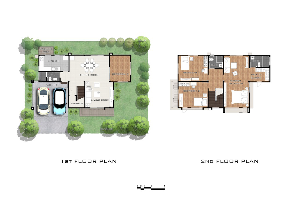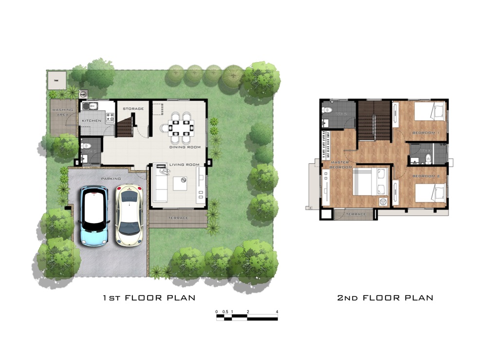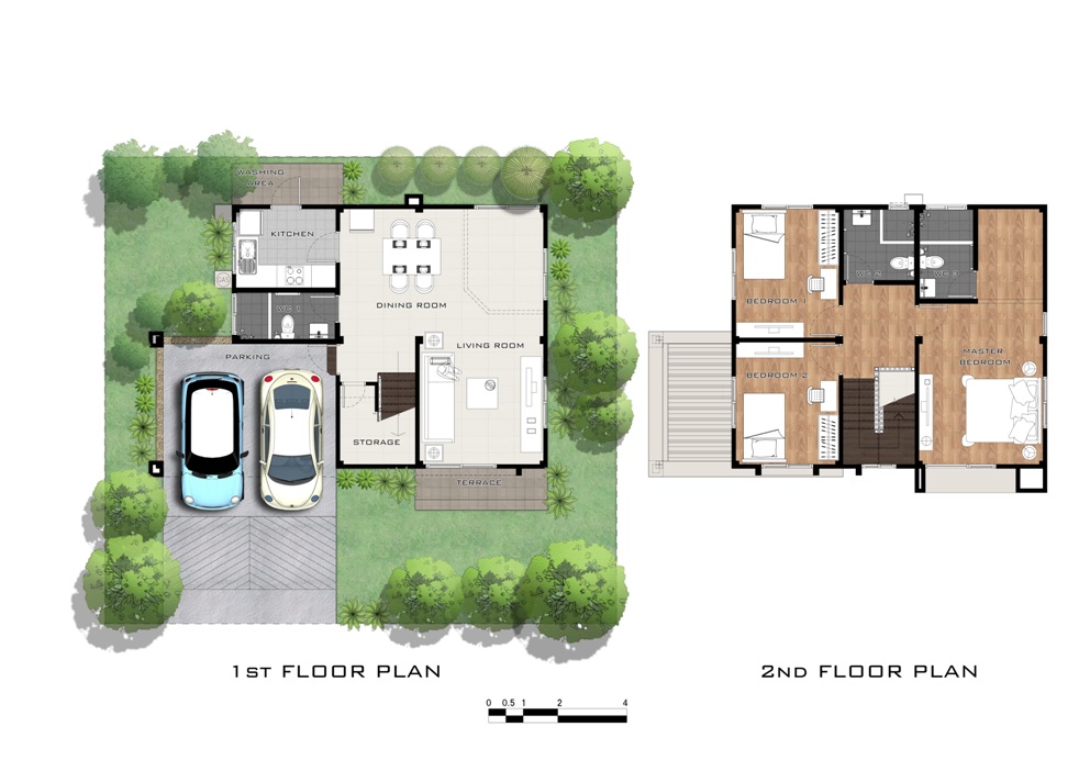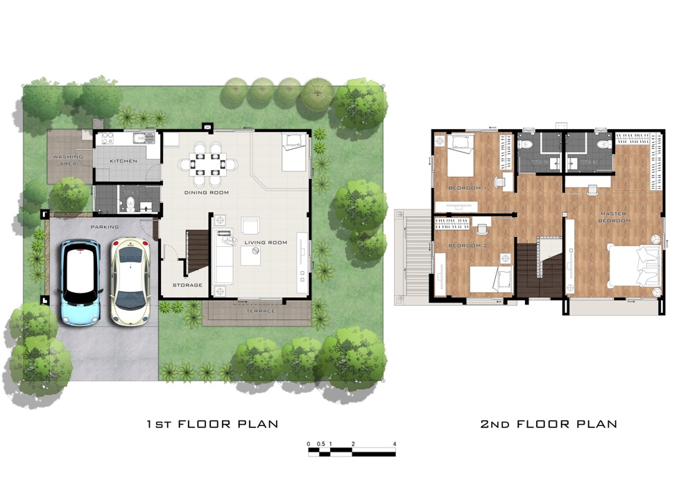 คลิกเพื่อดูแปลนบ้านได้ที่นี่ 4. แบบบ้าน ESQUILINO บ้านเดี่ยว 2 ชั้น สร้างบนแปลงที่ดินเนื้อที่เริ่มต้น 59 ตร.ว. ขนาดพื้นที่ใช้สอย 198 ตร.ม. 4 ห้องนอน 3 ห้องน้ำ 1 ห้องครัว 1 ห้องพักผ่อน และส่วนรับประทานอาหาร 2 ที่จอดรถ