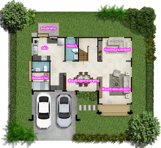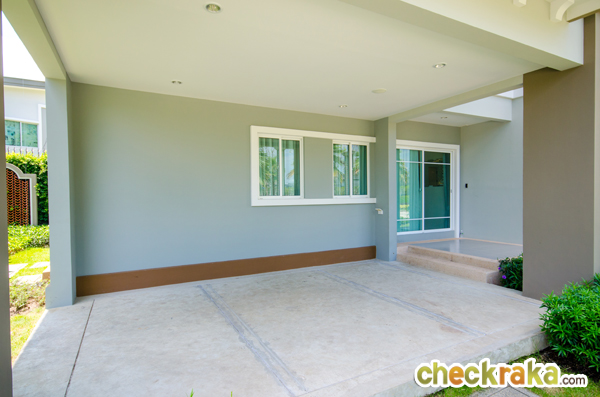 บ้านตัวอย่างแบบบ้านเปล่าจะเห็นพื้นที่จอดรถได้ชัดเจนขึ้น ว่าจากเสาหน้าบ้านตัวพื้นเป็นซีเมนต์ On Ground
