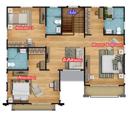 ขึ้นบันไดมาที่ชั้น 2 จะพบกับฟังก์ชั่นบ้านของห้องต่างๆ ดังรูปนี้ค่ะ พื้นชั้น 2 เป็นพื้นลามิเนต ความสูงเท่ากับชั้นล่าง