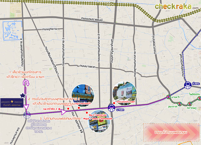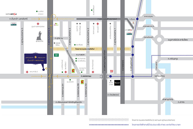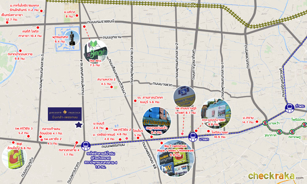 แผนผังรถไฟฟ้าสายสีน้ำเงินส่วนต่อขยาย (คลิกเพื่อดูภาพขยาย ) ระยะทางจากโครงการไปรถไฟฟ้าประมาณ 1 กม. โครงการอยู่ติดถนนใหญ่พุทธมณฑลสาย 4 สภาพแวดล้อมใกล้เคียงส่วนใหญ่จะเป็นร้านค้าใหญ่ๆ รายล้อมอยู่เต็มไปหมดตลอดทั้งถนนเลยค่ะ ไม่ว่าจะเป็น ร้านขายเฟอร์นิเจอร์, ร้านทองขนาดใหญ่, อู่ซ่อมรถ และอื่นๆ อีกมากมาย