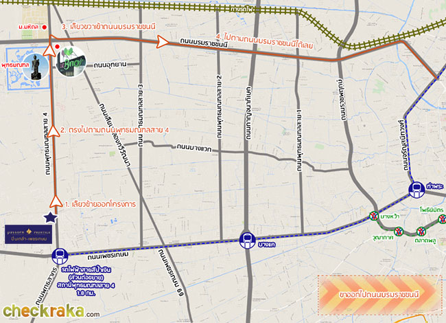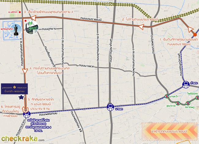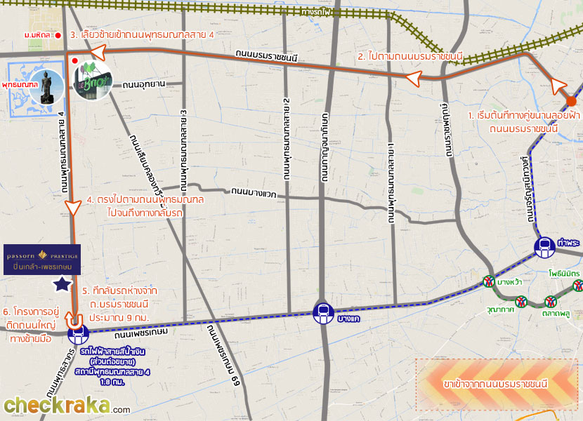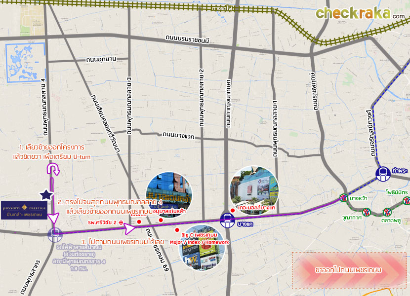 เริ่มต้นกันที่ถนนพระราม 8 ขับมาเรื่อยๆ จนถึงสะพานพระราม 8 เจอป้ายบอกทาง ให้ไปตามทางพุทธมณฑลค่ะ มาจนถึงทางแยก ให้เลี้ยวขวาเข้าถนนบรมราชชนนีค่ะ มาอยู่บนถนนคู่ขนานลอยฟ้าบรมราชชนนีแล้วค่ะ เจอป้ายบอกทางตามภาพ เริ่มเห็นทางลงแล้ว เจอทางลงแล้วค่ะ ลงมาเจอถนนบรมราชชนนีระดับปกติ ขิดซ้ายใช้ถนนคู่ขนาน เจอป้ายไปพุทธมณฑลสาย 3 ยังไม่ต้องเลี้ยวค่ะ ให้ตรงไปก่อน ค่อยมาเลี้ยวตรงนี้ค่ะ ช่วงหัวโค้งนี้จะมีคอมมิวนิตี้มอลล์ The Brio ตั้งอยู่ ขับตรงมาจะเจอพุทธมณฑลอยู่ด้านขวามือ เข้าถนนพุทธมณฑลสาย 4 แล้วค่ะ ขับตรงมาเรื่อยๆ จะเจอ Image Mall อยู่ด้านซ้ายมือ ชิดซ้ายตรงไปจะเจอทางกลับรถค่ะ พอกลับรถแล้ว ก็เห็นโครงการอยู่อีกไม่ไกลแล้วค่ะ เจอแล้ว ภัสสร เพรสทีจ ปิ่นเกล้า - เพชรเกษม ทางเข้าโครงการอยู่ติดถนนใหญ่เลยค่ะ เส้นทางเข้าโครงการที่ 2 - มาจากถนนเพชรเกษม