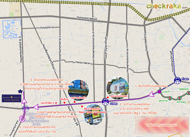 แผนที่โครงการ ภัสสร เพรสทีจ ปิ่นเกล้า - เพชรเกษม (คลิกเพื่อดูภาพขยาย ) แผนที่ Google แบบกว้าง แสดงสถานที่สำคัญรอบๆ โครงการ (คลิกเพื่อดูภาพขยาย ) (พิกัด Google 13.719488, 100.329869 ) Big C เพชรเกษม ห่างจากโครงการประมาณ 6.8 กม. ค่ะ มีทั้ง Major Cineplex, Index Living Mall, Homework โรงเรียนอนุบาลเด่นหล้า ห่างจากโครงการ 6.5 กม. โรงพยาบาลเกษมราษฎร์บางแค ห่างจากโครงการประมาณ 8.7 กม. เดอะมอลล์ บางแค ห่างจากโครงการประมาณ 9.8 กม. Community Mall บนถนนพุทธมณฑลสาย 4 "The Brio" ด้านในมี FoodLand ด้วยค่ะ ห่างจากโครงการประมาณ 7.5 กม. แล้วก็มี Big C อ้อมใหญ่ ที่ใกล้โครงการอีกที่ ไปทางพุทธมณฑลสาย 5 ห่างจากโครงการประมาณ 6.6 กม. 1. เดินทางด้วยรถยนต์ส่วนตัว